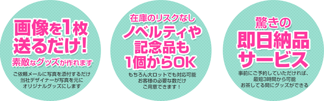 第三者の知的財産権(著作権)、肖像権、プライバシーの権利、名誉、その他の権利または利益を侵害する場合や、当社が不適切と判断する場合はご利用いただけません。 弊社の認識外の物で製作したのち、問題が生じた場合、ご注文者様に全責任があり、弊社は責任を負いません。