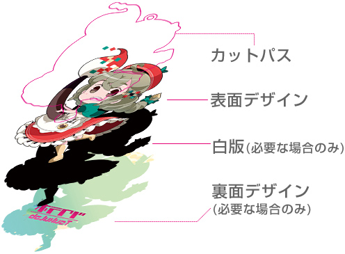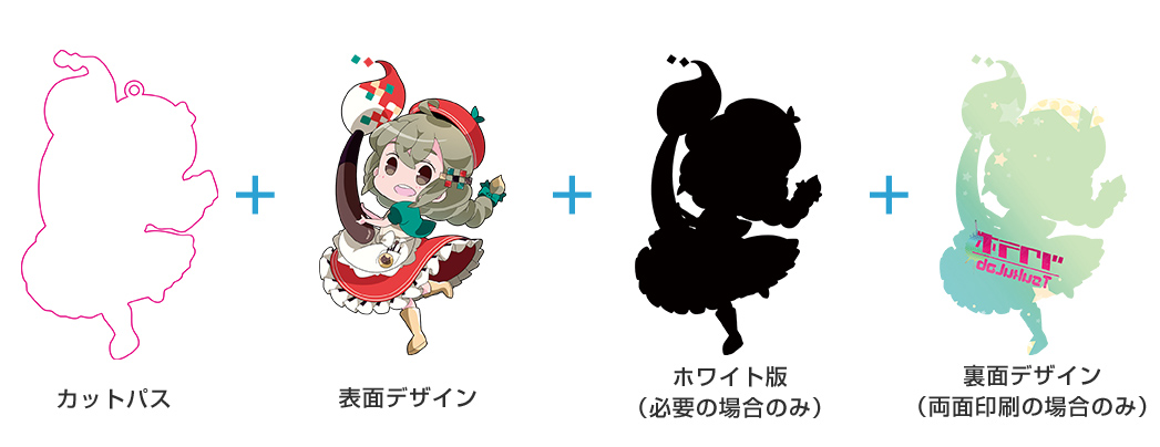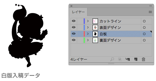 入稿時には表面デザイン、カットパス、白版データがそれぞれ必要となります。