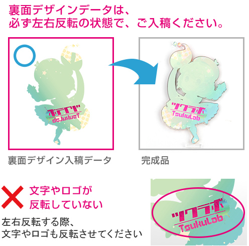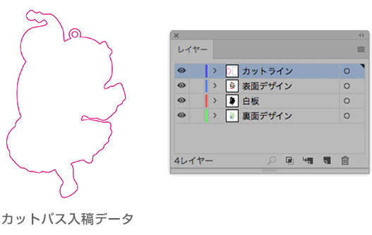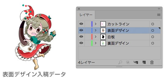 「表面デザイン」「カットパス」「白版」は必ずレイヤーを分けて入稿データを作成してください。両面印刷をご利用の場合は、「裏面デザイン」レイヤーに配置してください。