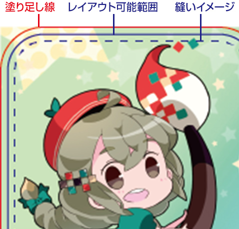 | 05 | 塗り足しまで絵が描かれている。 仕上がり線や縫い目ギリギリの部分に大事な文字・絵柄・枠素材などがない。 |