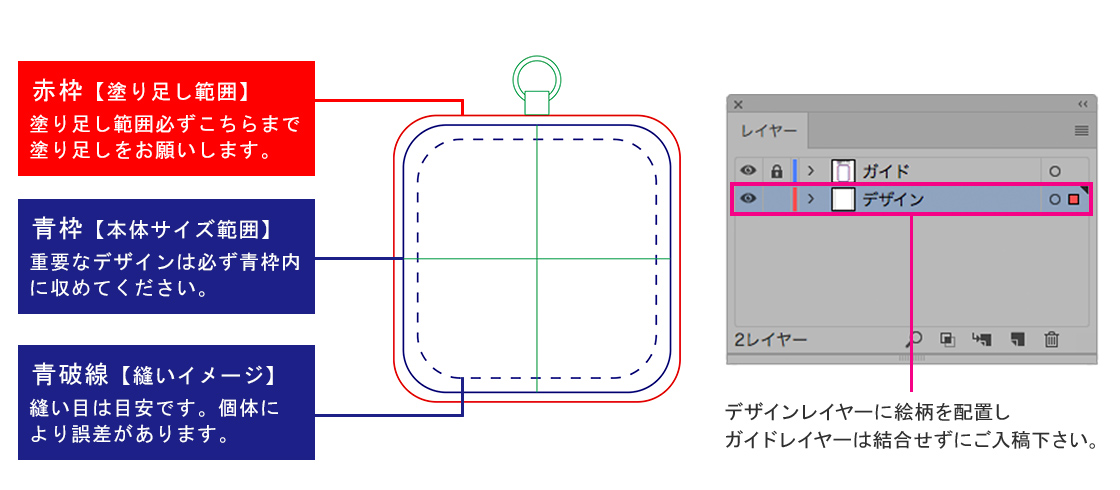当サイトからダウンロードいただいたテンプレートには、ガイド線を入れております。下記の説明に従って、デザインを配置してください。