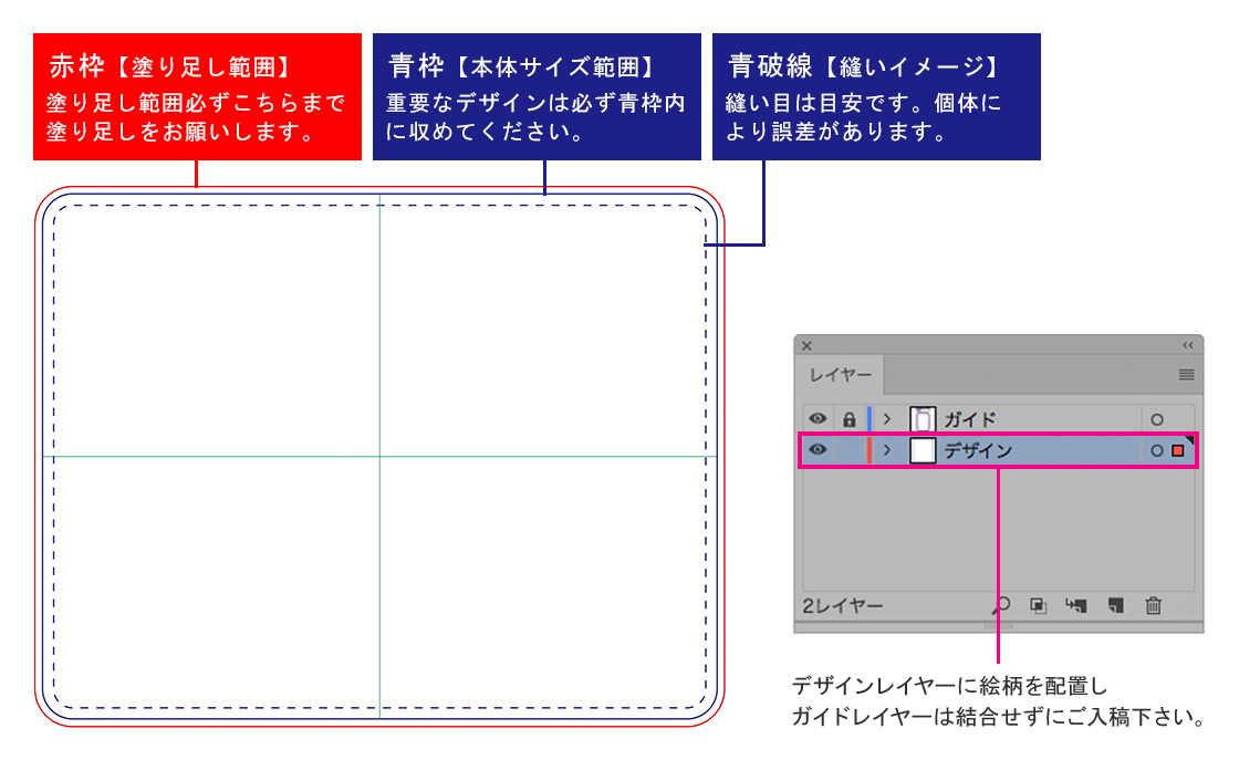 当サイトからダウンロードいただいたテンプレートには、ガイド線を入れております。下記の説明に従って、デザインを配置してください。